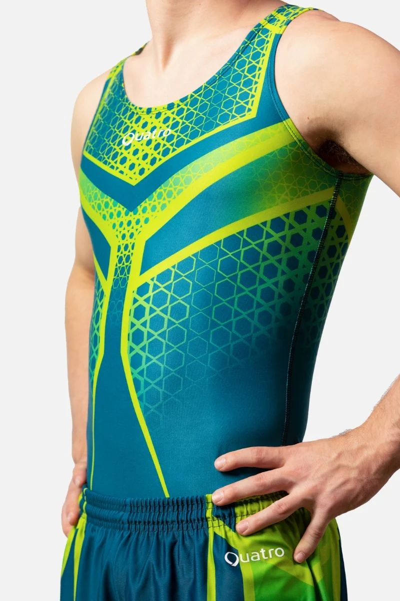 Quatro's Men's Leotard designs are based on our top-notch singlet pattern, specially crafted to fit the male body better. We've designed it with a boxer cut leg to avoid any uncomfortable bunching, making it the most comfortable choice in men's gymnastics wear!
